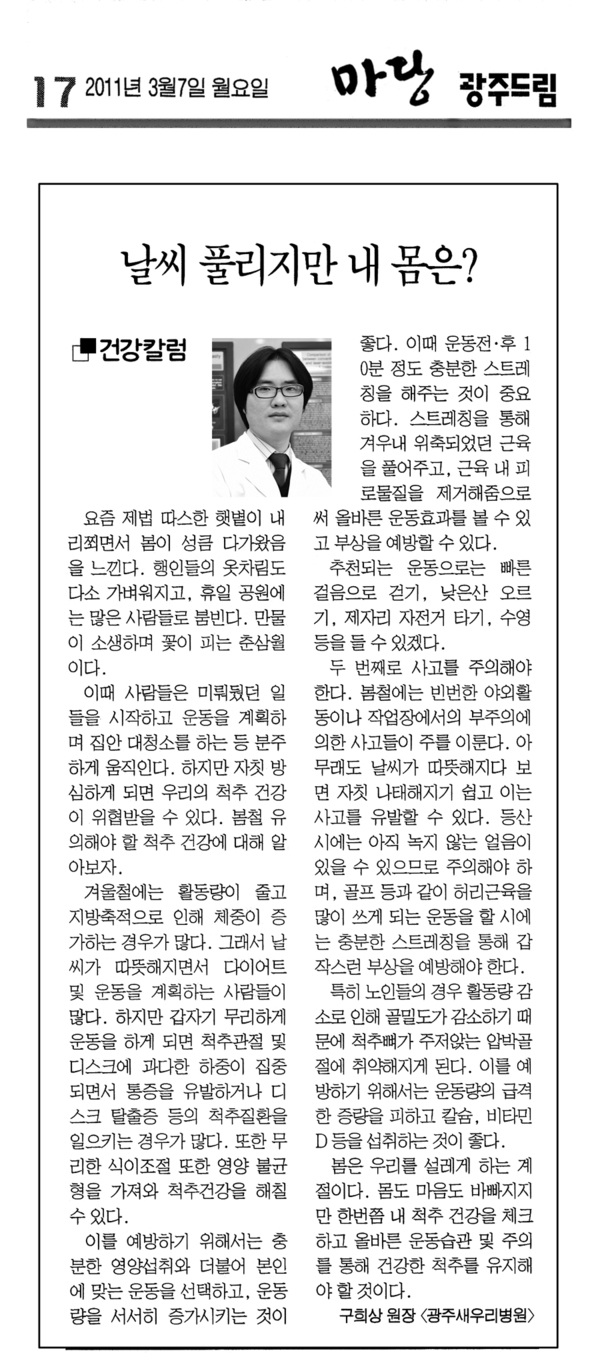 유난히 춥고 눈이 많이 내렸던 올 겨울이었다. 대부분의 사람들이 추위를 피하느라 잔뜩 움츠리고 있었을 것이다. 하지만 요즘 제법 따스한 햇볕이 내리쬐면서 봄이 성큼 다가오는 것을 느낄 수 있다. 행인들의 옷차림도 다소 가벼워지고, 휴일 공원에는 많은 사람들로 발 디딜 틈이 없을 정도이다. 일월이 달력상의 새해지만 만물이 소생하며 꽃이 피는 춘삼월이 한해의 시작이라 해도 과언은 아닐 것이다. 이때 많은 사람들이 미뤄두었던 일들을 시작하고 운동을 계획하며 집안 대청소를 하는 등 분주하게 움직일 것이다. 하지만 자칫 방심하게 되면 우리의 척추 건강이 위협받을 수 있다. 봄철 유의해야 할 척추 건강에 대해 알아보자. 겨울철에는 대부분 활동량 감소 및 지방축적으로 인해 체중이 증가하는 경우가 많다. 날씨가 따뜻해지면서 다이어트 및 운동을 계획하는 사람들이 많을 것이다. 하지만 갑자기 무리하게 운동을 하게 되면 척추관절 및 디스크에 과다한 하중이 집중되면서 통증을 유발할 수 있고 디스크 탈출증 등의 척추질환을 일으키는 경우가 많으며 기존의 척추질환을 악화시킬 수 있다. 또한 무리한 식이조절 또한 영양 불균형을 가져와 척추건강을 해칠 수 있다. 이를 예방하기 위해서는 충분한 영양섭취와 더불어 본인에 맞는 운동을 선택하고, 운동량을 서서히 증가시키는 것이 좋다.이때 운동전·후, 10분 정도 충분한 스트레칭을 해주는 것이 중요하다. 스트레칭을 통해 겨우내 위축되었던 근육을 풀어주고, 근육 내 피로물질을 제거해줌으로써 올바른 운동효과를 볼 수 있고 부상을 예방할 수 있다. 추천되는 운동으로는 빠른 걸음으로 걷기, 낮은 산 오르기, 제자리 자전거 타기, 수영 등을 들 수 있겠다. 특별히 심각한 척추질환이 없거나 몸에 무리만 가지 않는다면 적절한 웨이트 트레이닝 및 척추강화 운동도 괜찮을 것이다. 두 번째로 사고를 주의해야 한다. 겨울철 빙판에 의한 낙상이 주로 사고 원인이었다면 봄철에는 빈번한 야외활동이나 작업장에서의 부주의에 의한 사고들이 주를 이룬다. 아무래도 날씨가 따뜻해지다 보면 자칫 나태해지기 쉽고 이는 사고를 유발할 수 있다. 등산 시에는 아직 녹지 않는 얼음이 있을 수 있으므로 주의해야 하며, 골프 등과 같이 허리근육을 많이 쓰게 되는 운동을 할 시에는 충분한 스트레칭을 통해 갑작스런 부상을 예방해야 한다. 또한 작업장에서는 안전수칙을 철저히 준수하고 작업 전 안전교육 및 정신교육을 통해 사고의 위험성을 각인해야 한다. 특히 노인들의 경우 활동량 감소로 인해 골밀도가 감소하기 때문에 척추뼈가 주저앉는 압박골절에 취약해지게 된다. 이를 예방하기 위해서는 운동량의 급격한 증량을 피하고 칼슘, vit. D등을 섭취하는 것이 좋다. 봄은 우리를 설레게 하는 계절이다. 몸도 마음도 바빠지지만 한번쯤 내 척추 건강을 체크하고 올바른 운동습관 및 주의를 통해 건강한 척추를 유지해야 할 것이다.