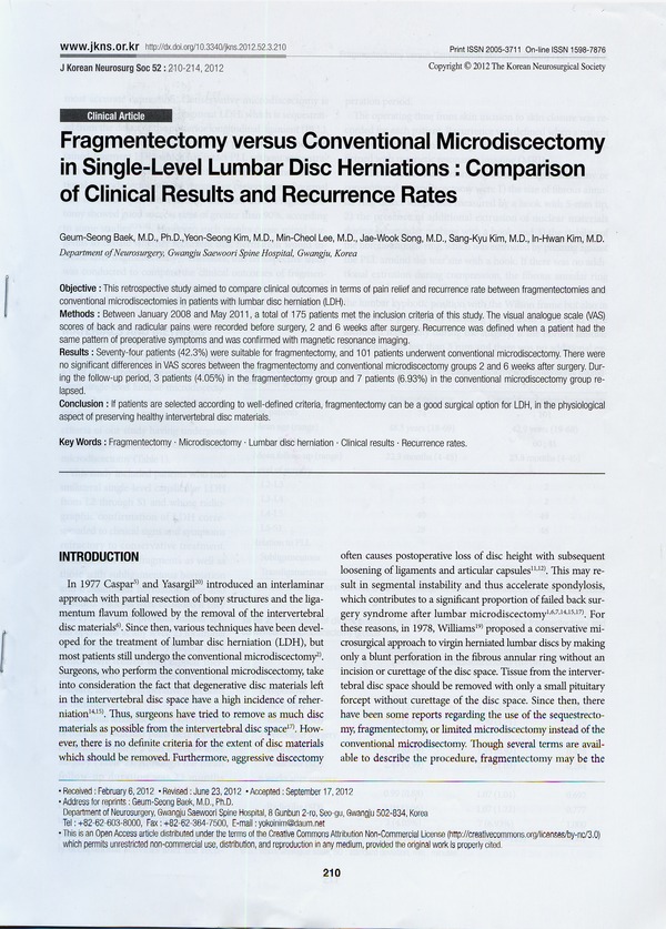 게재내용 : Fragmentectomy versus Conventional Microdiscectomy in Single-Level Lumbar Disc Herniations: Comparison of Clinical Results and Recurrence Rates