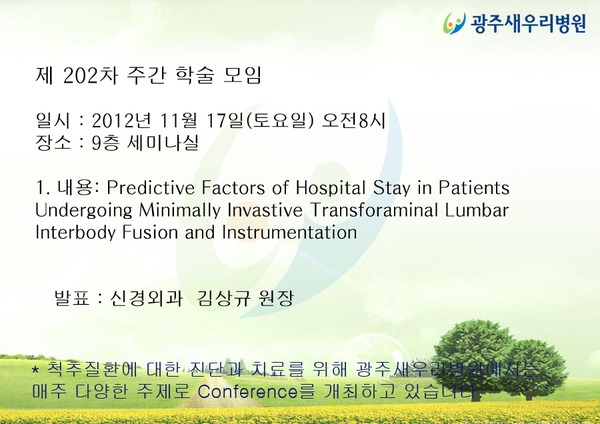 * 척추질환에 대한 진단과 치료를 위해 광주새우리병원에서는 매주 다양한 주제로 Conference를 개최하고 있습니다.