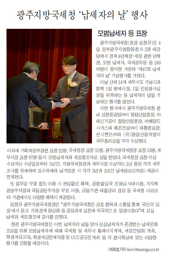 광주새우리병원 "광주지방국세청장의 표창수여"
