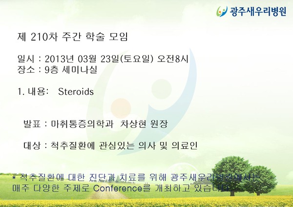 * 척추질환에 대한 진단과 치료를 위해 광주새우리병원에서는 매주 다양한 주제로 Conference를 개최하고 있습니다.