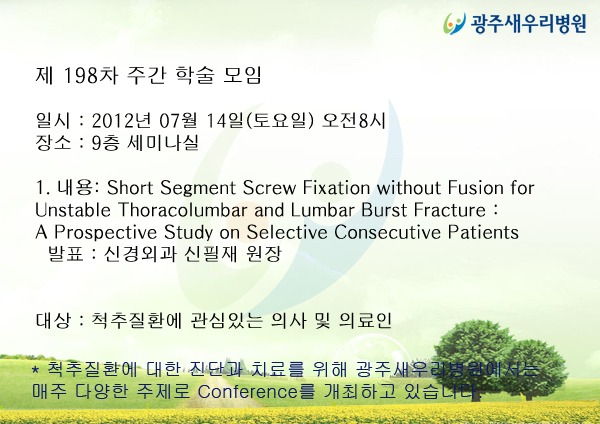 * 척추질환에 대한 진단과 치료를 위해 광주새우리병원에서는 매주 다양한 주제로 Conference를 개최하고 있습니다.