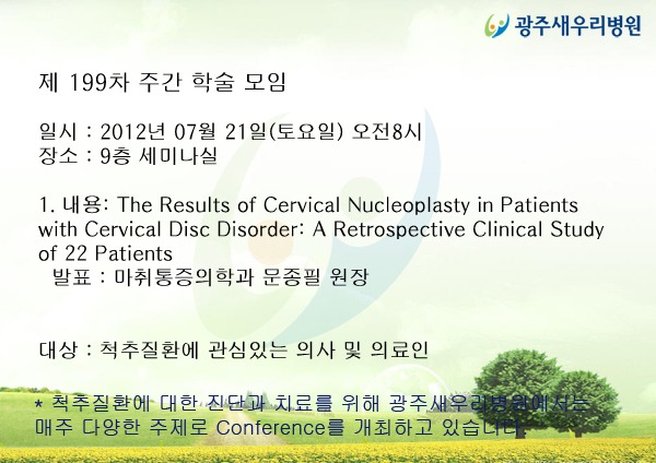 1. 내용: The Results of Cervical Nucleoplasty in Patients with Cervical Disc Disorder: A Retrospective Clinical Study of 22 Patients