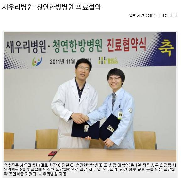 척추전문 새우리병원(대표원장 이민철)과 청연한방병원(대표원장 이상영)은 1일 광주 서구 화정동 새우리병원 9층 회의실에서 상호 의료협력으로 의료 자문 및 진료의뢰, 관련 정보 교류 등을 담은 의료협약 조인식을 가졌다.