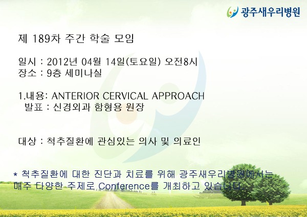 * 척추질환에 대한 진단과 치료를 위해 광주새우리병원에서는 매주 다양한 주제로 Conference를 개최하고 있습니다.