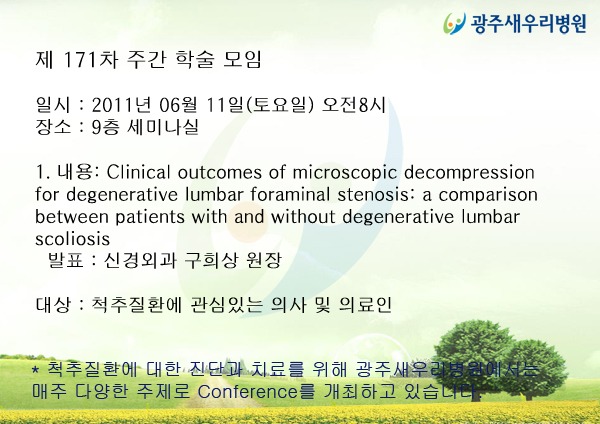 * 척추질환에 대한 진단과 치료를 위해 광주새우리병원에서는 매주 다양한 주제로 Conference를 개최하고 있습니다.