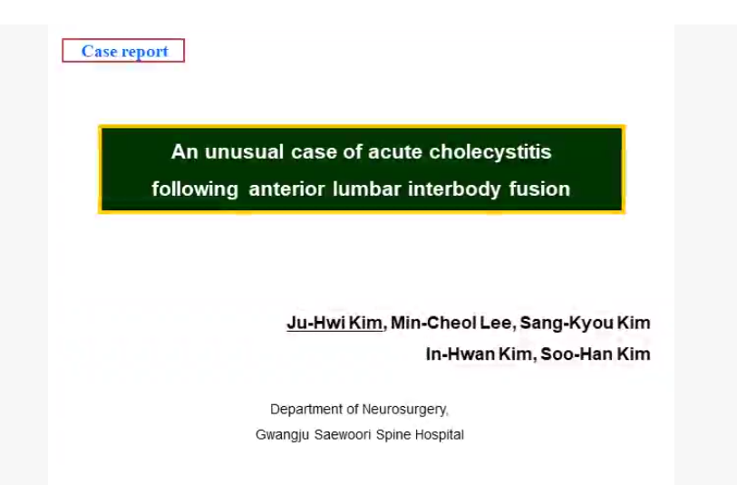 - 일자 : 2021년 4월 29일(목) ~ 5월 1일(토)장소 : 온라인주제 : An unusual case of acute cholecystitis followinganterior lumbar interbody fusion발표자 : 김주휘 원장